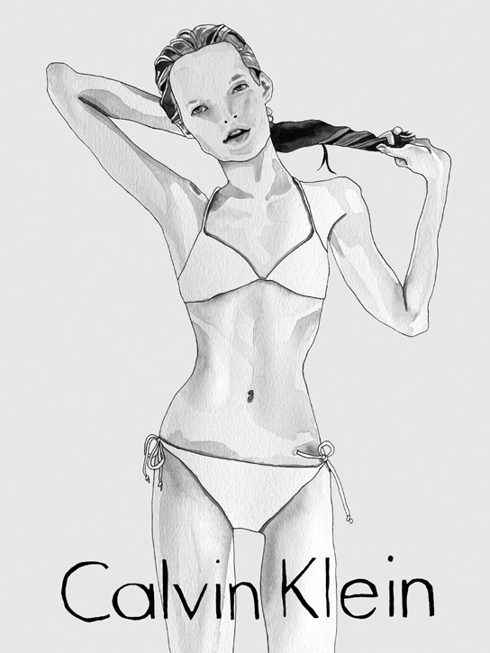 In part, I wrote and drew my illustrated novel Justine in an attempt to exorcise the demon. The very first page of the book is a drawing of Kate Moss in that white Calvin Klein string bikini. Ali, the book’s teenaged narrator, becomes fascinated — unhealthily obsessed — with Justine, a girl so tall and thin she looks almost two-dimensional. I put the white string bikini on Justine. She shoplifts it out of a Bloomingdale’s dressing room, wears it when the two girls swim together in Justine’s family’s inground pool, and then again, later, face down in this same pool, dead. Like Anna, I wanted to submerge and kill what was monstrous. And like Rachel, I made a copy of its image.