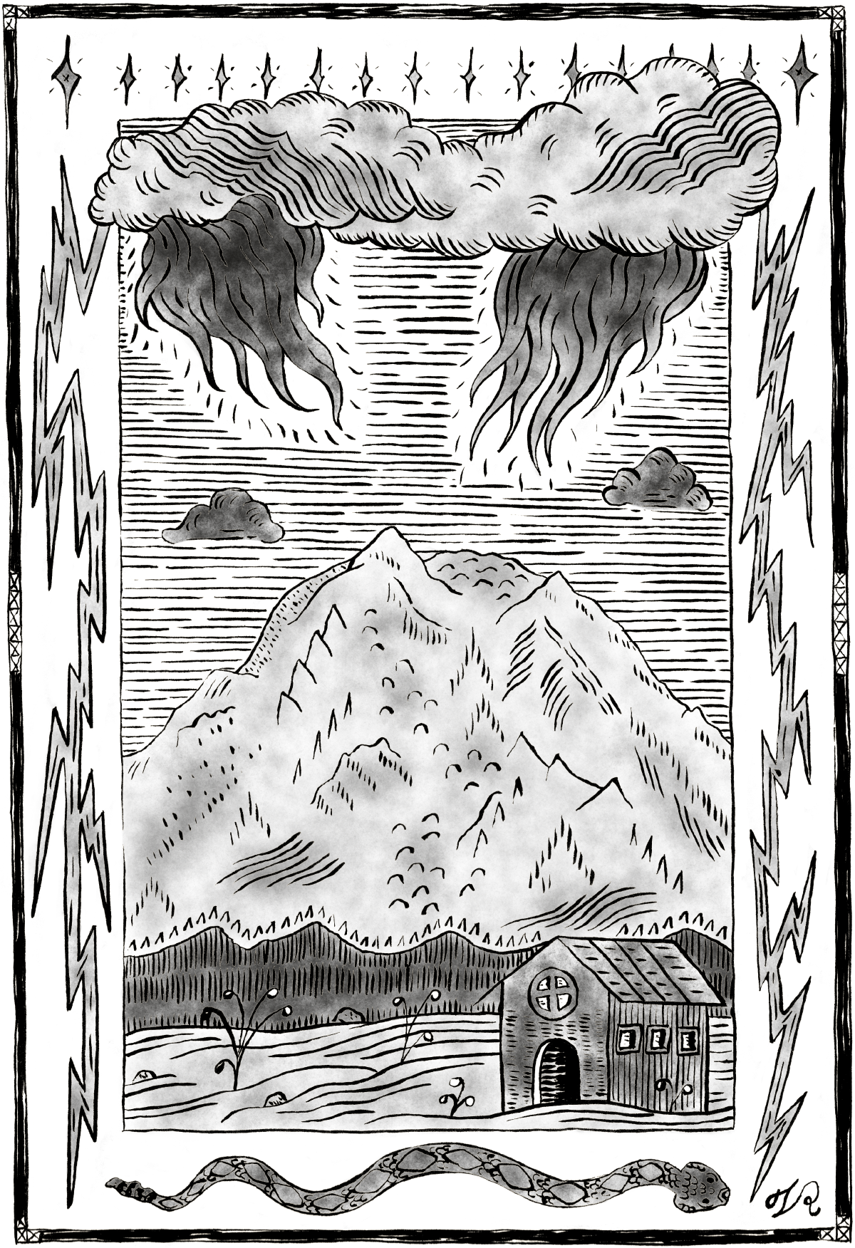Pray rain comes with this lightning. Thunder erupts like gunfire o’er the sky like the mountain ranges having conversation And I carry my shovel everywhere I go even to bed where I keep my pistol I look into the barrel of the cloud I know holds lightning– please do not take my house tonight, I already lost a rattlesnake today.